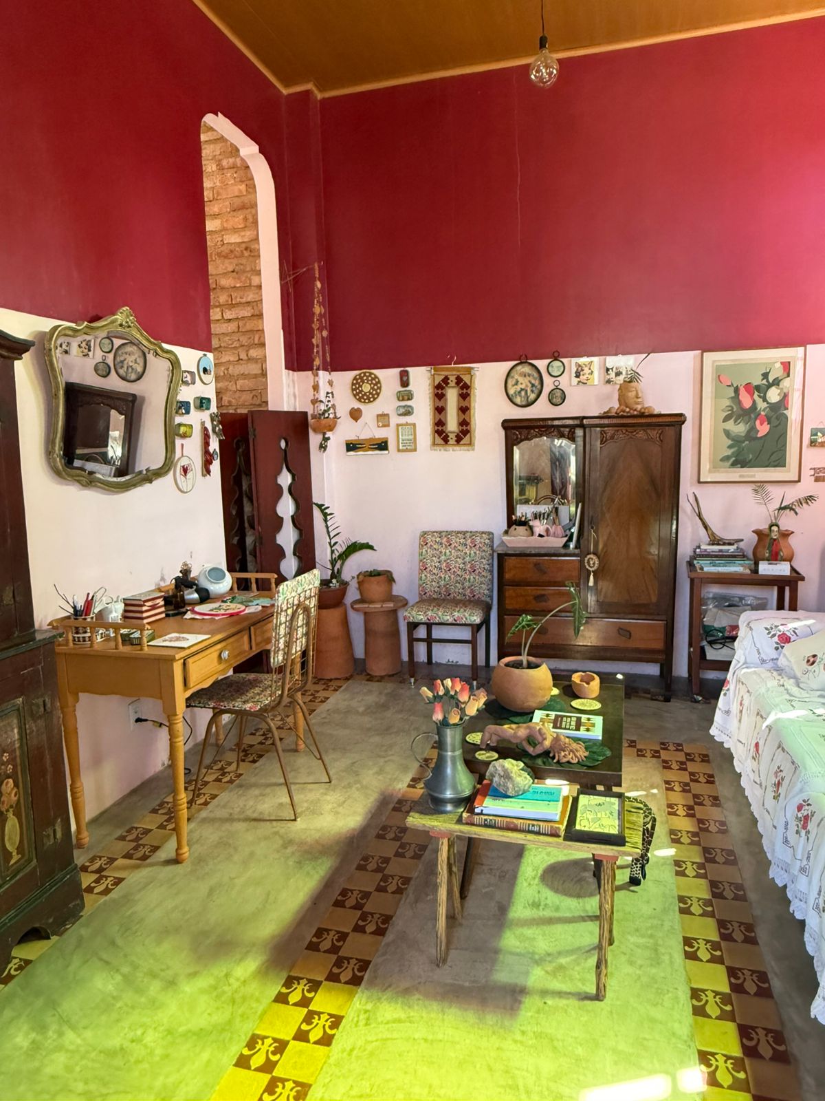 A Casa Velha parece ter saído de um livro de contos. Há arte por todos os lados: das paredes que revelam os tijolos antigos aos móveis herdados da família e garimpados em brechós, das colchas afetivas aos desenhos, bordados e aquarelas.