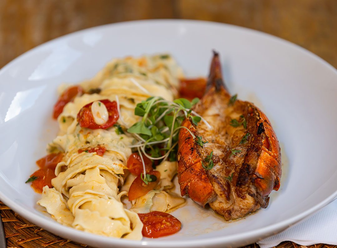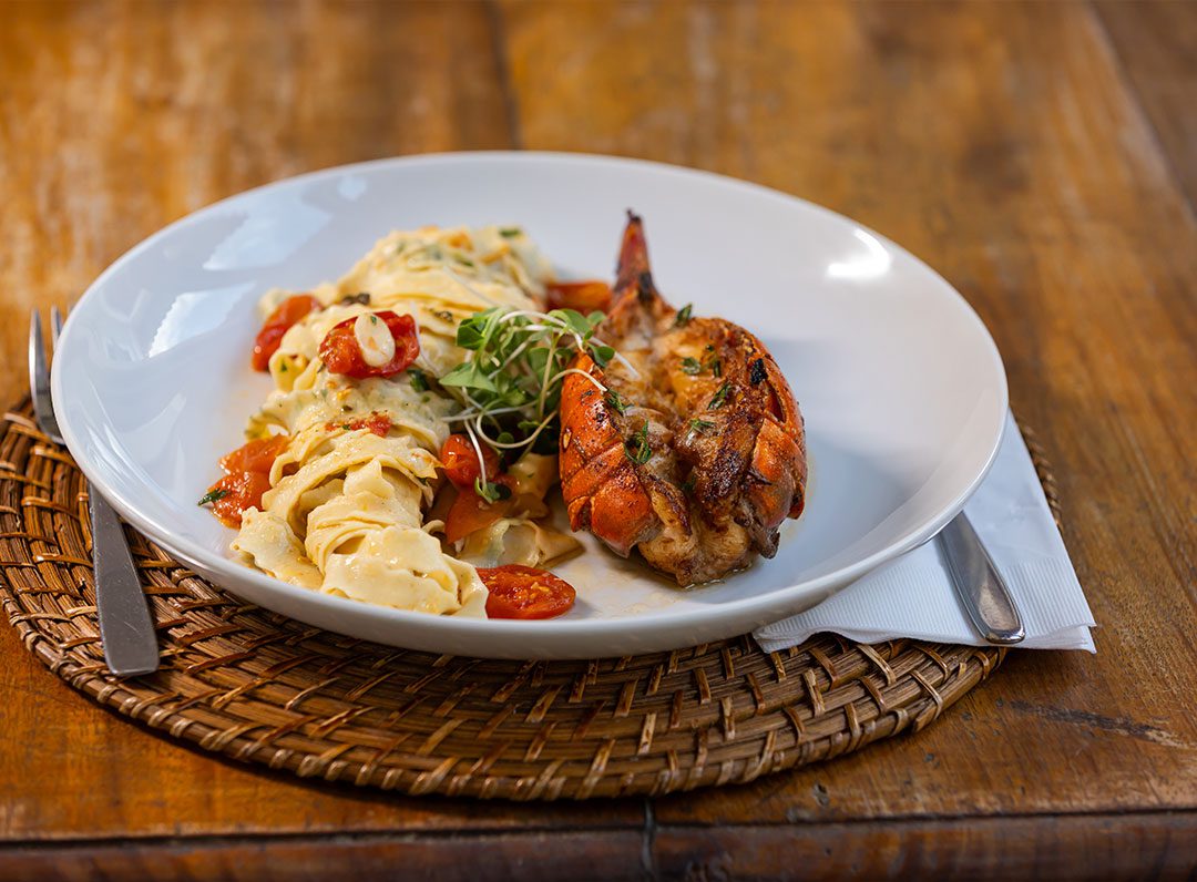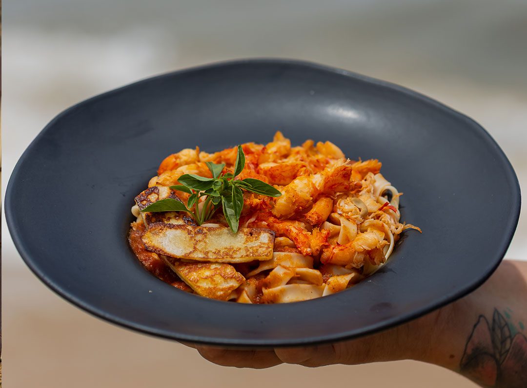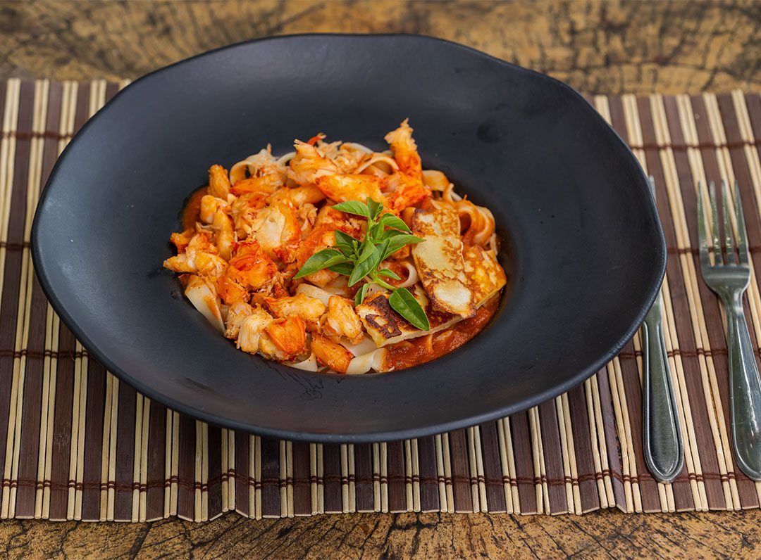 Talharim com molho pomodoro artesanal, com pernil de lagosta grelhado no azeite e queijo coalho