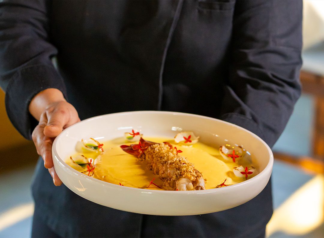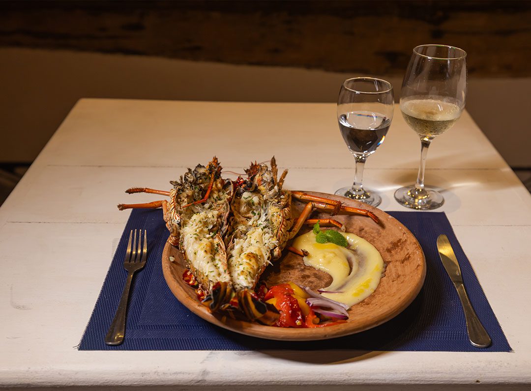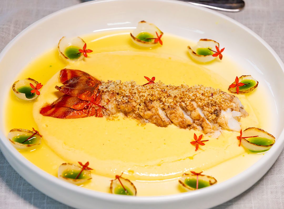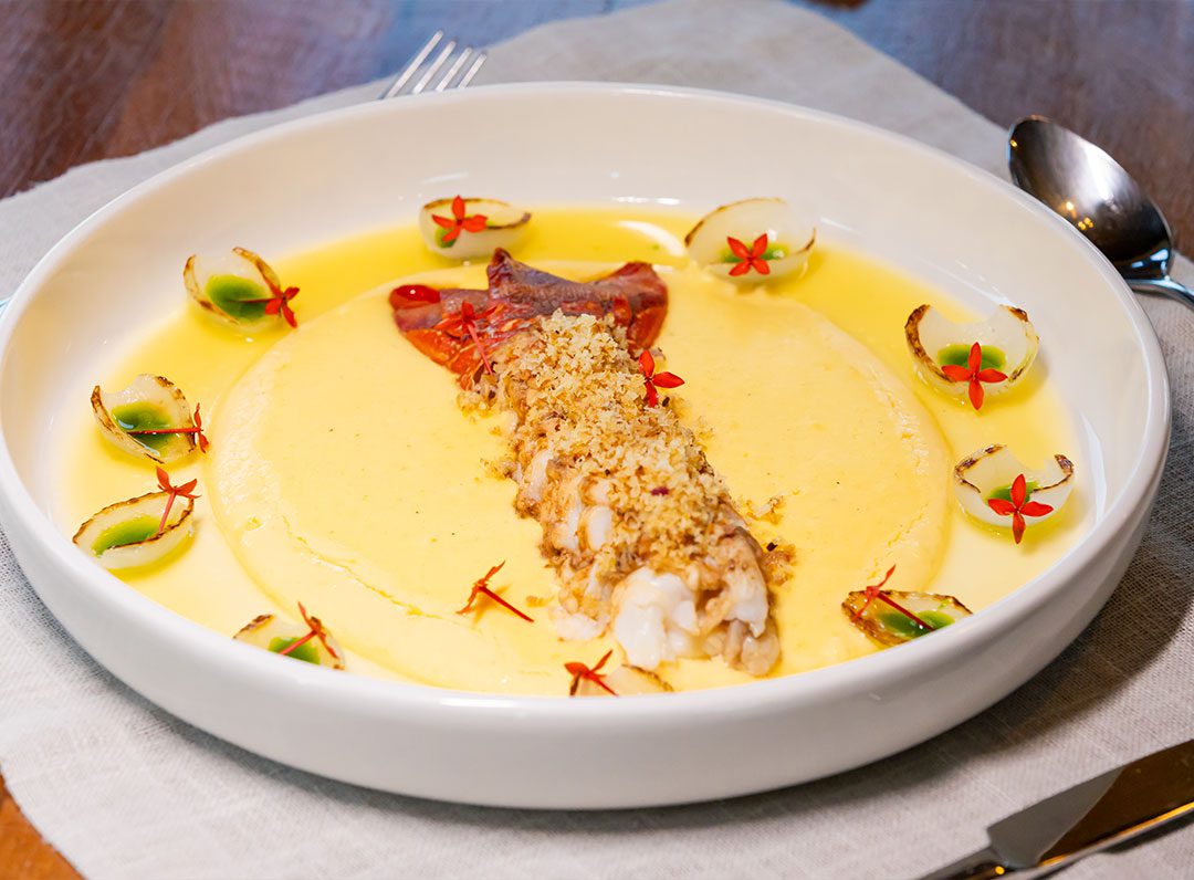 Lagosta Desnuda – Grelhada, musseline de baroa, Pétalas de Cebola Baby tostadas, Molho Beurre Blanc, Azeite de Salsa e crocante de Panko com Raspas de Limão Siciliano
