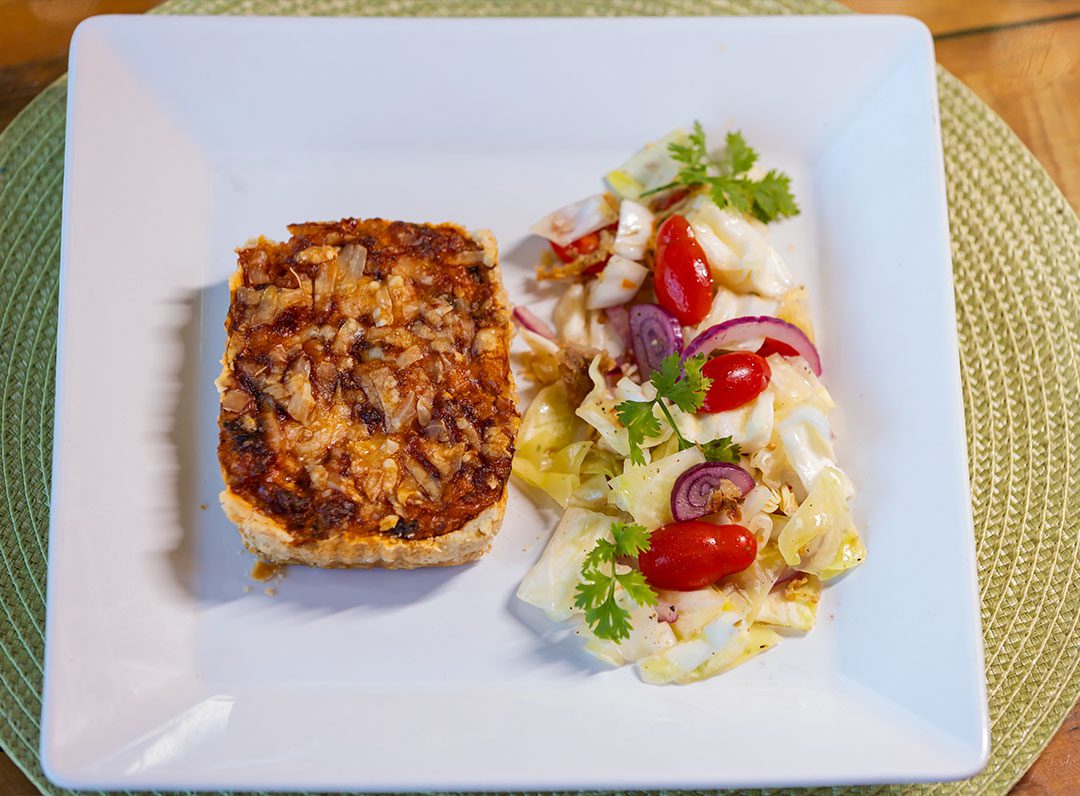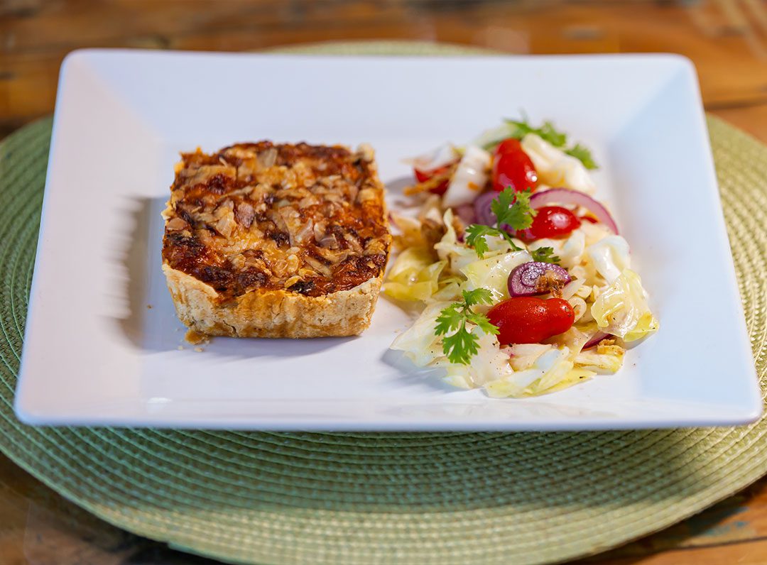 Quiche de lagosta gratinada com salada de repolho, tomate cereja e molho de gengibre.