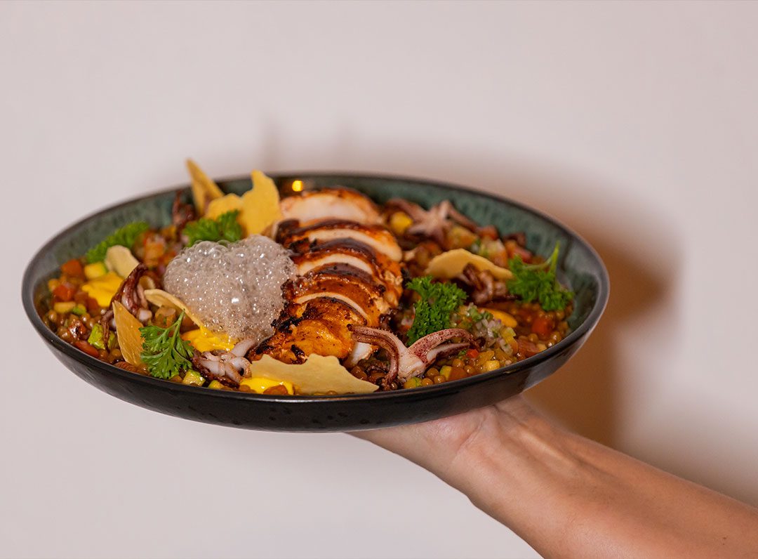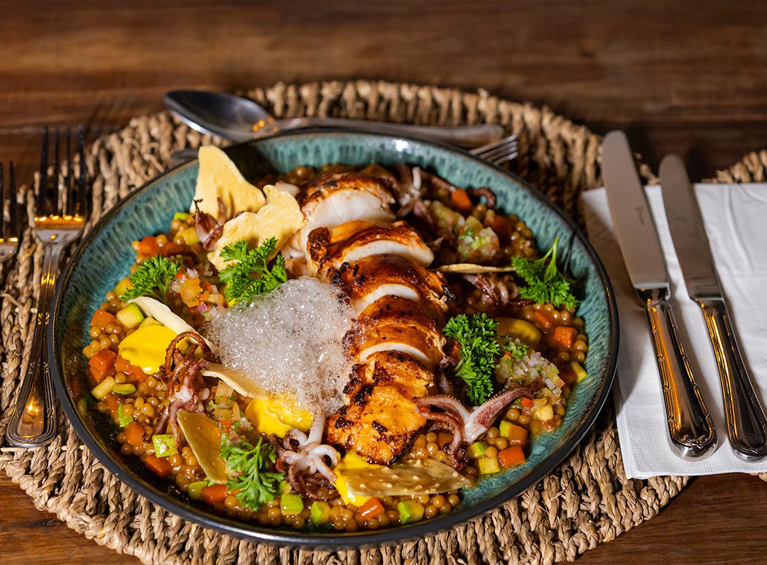 Filé de lagosta grelhado acompanhado de fregola sarda com mini tentáculos de lula, molho lambão e crocante de tapioca.