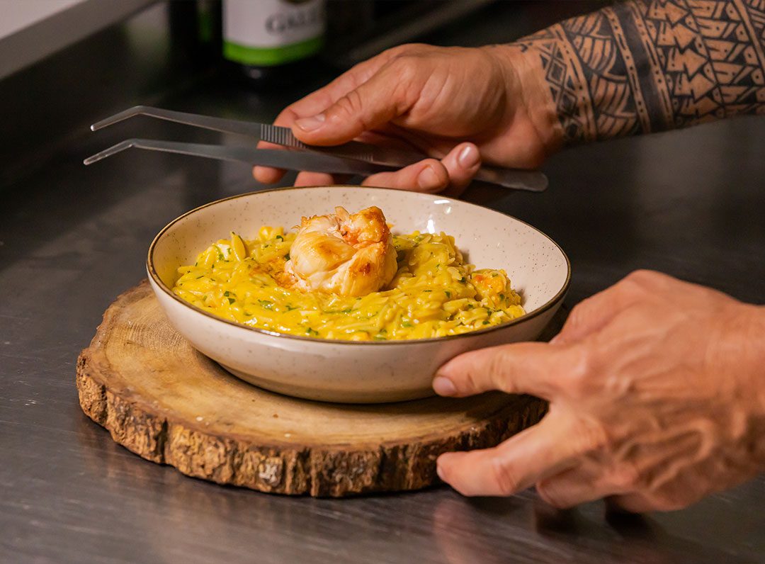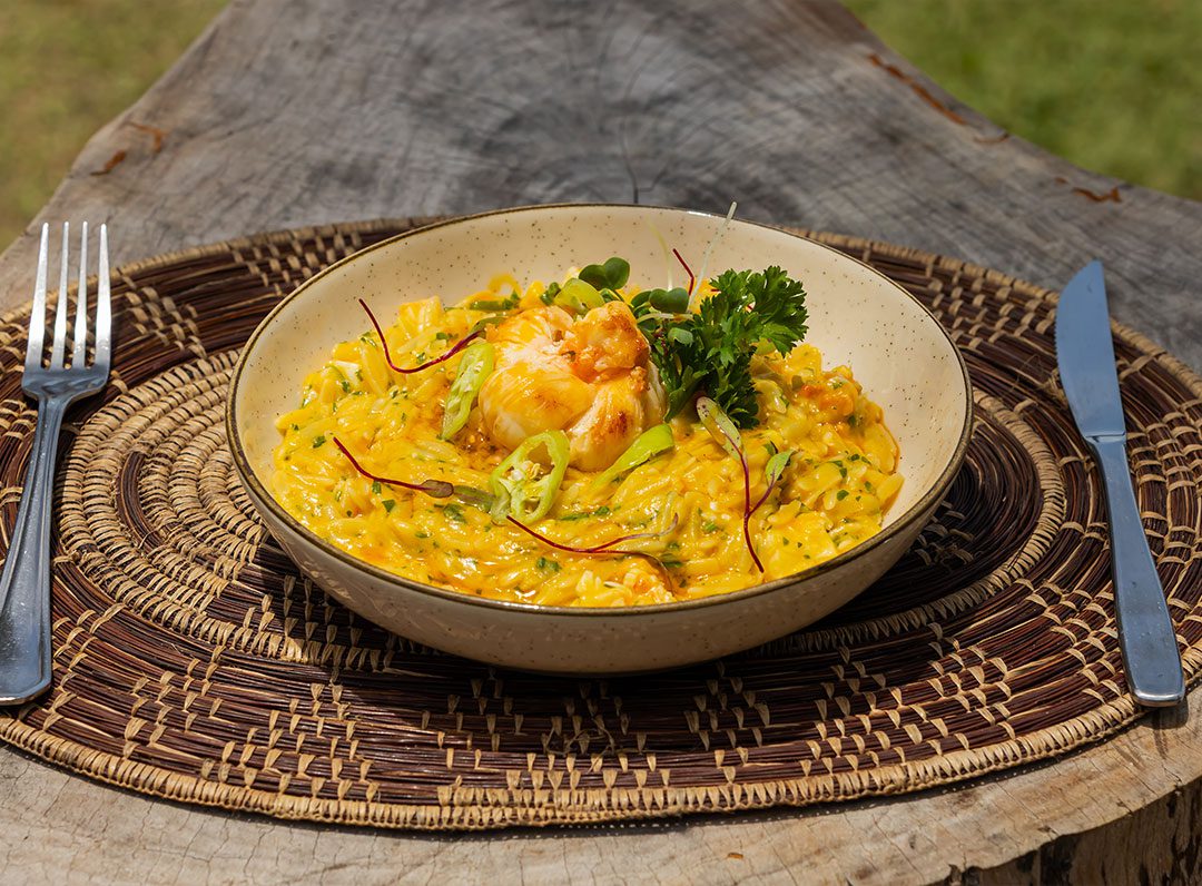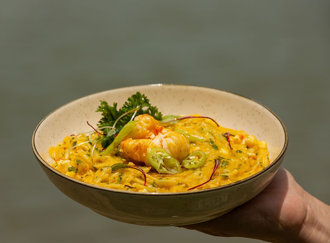 Massa em formato de grãos envolvida em molho de moqueca de lagosta, com leite de coco e azeite de dendê.