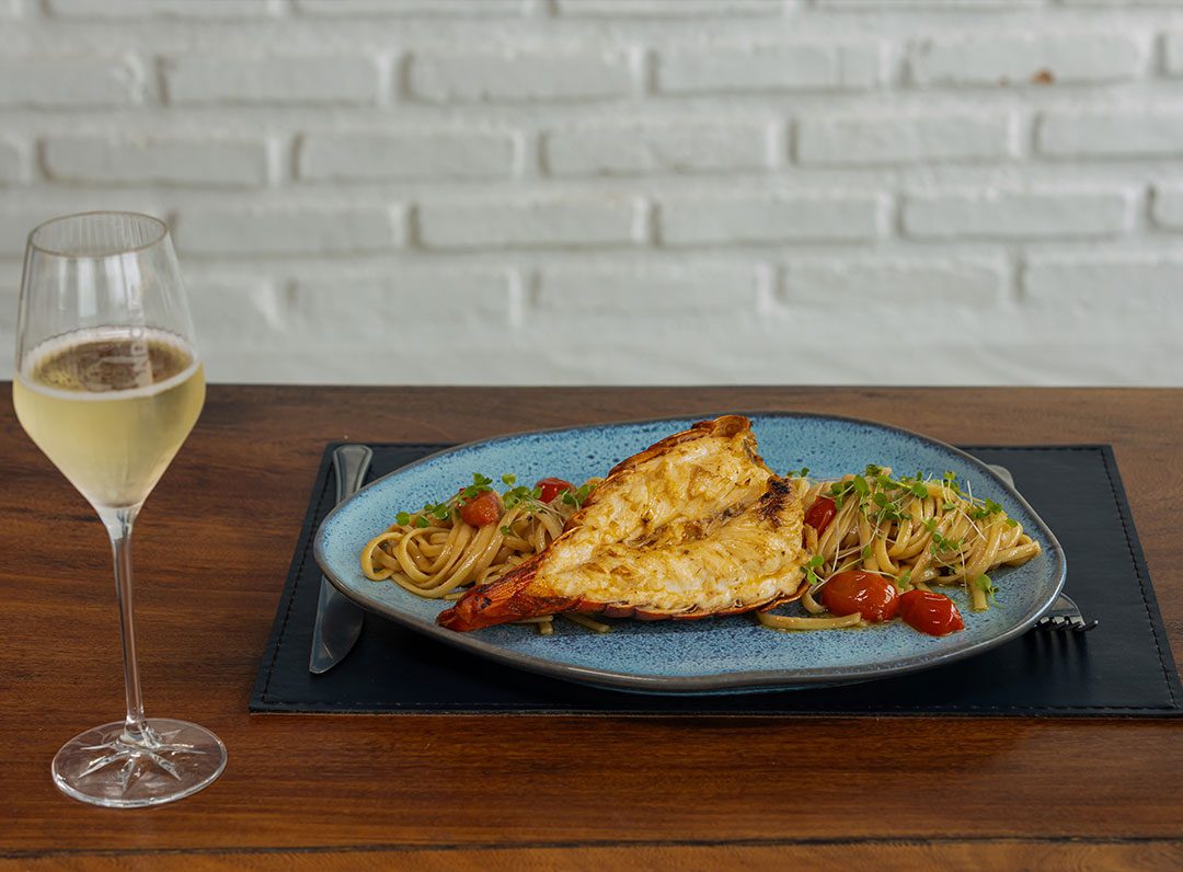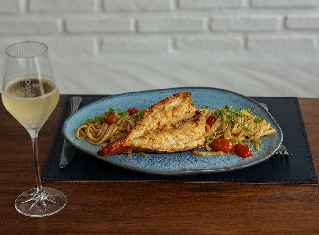 Lagosta acompanhada de linguine ao molho de espumante com limão siciliano, manteiga e queijo. Uma taça de espumante acompanha o prato.