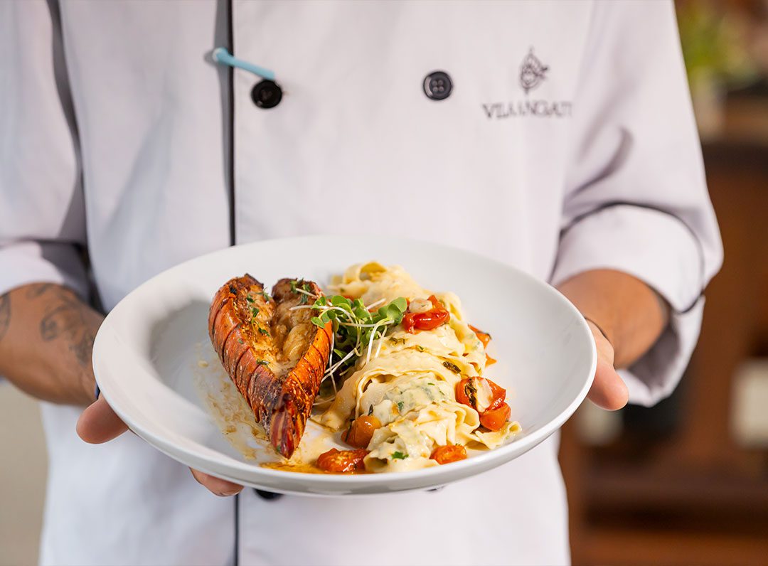 Lagosta delicadamente selada na manteiga de Tomilho, com uma massa artesanal, envolta por tomates confit e lâminas de alho.
