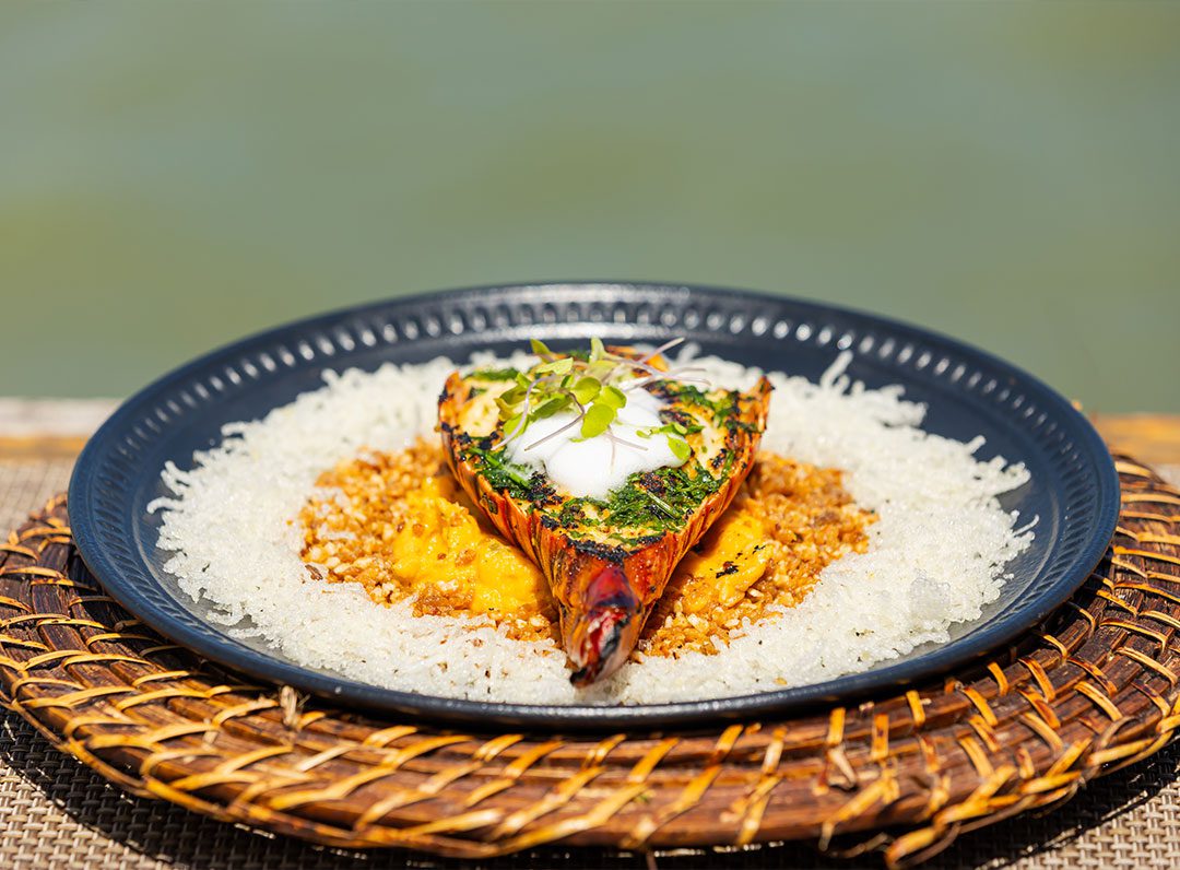 Lagosta grelhada e flambada na cachaça, coroada com palmito artesanal e Dendê e leite de coco. farofa de castanhas com panceta, pururuca de Harusame, Espuma de gengibre e brotos.