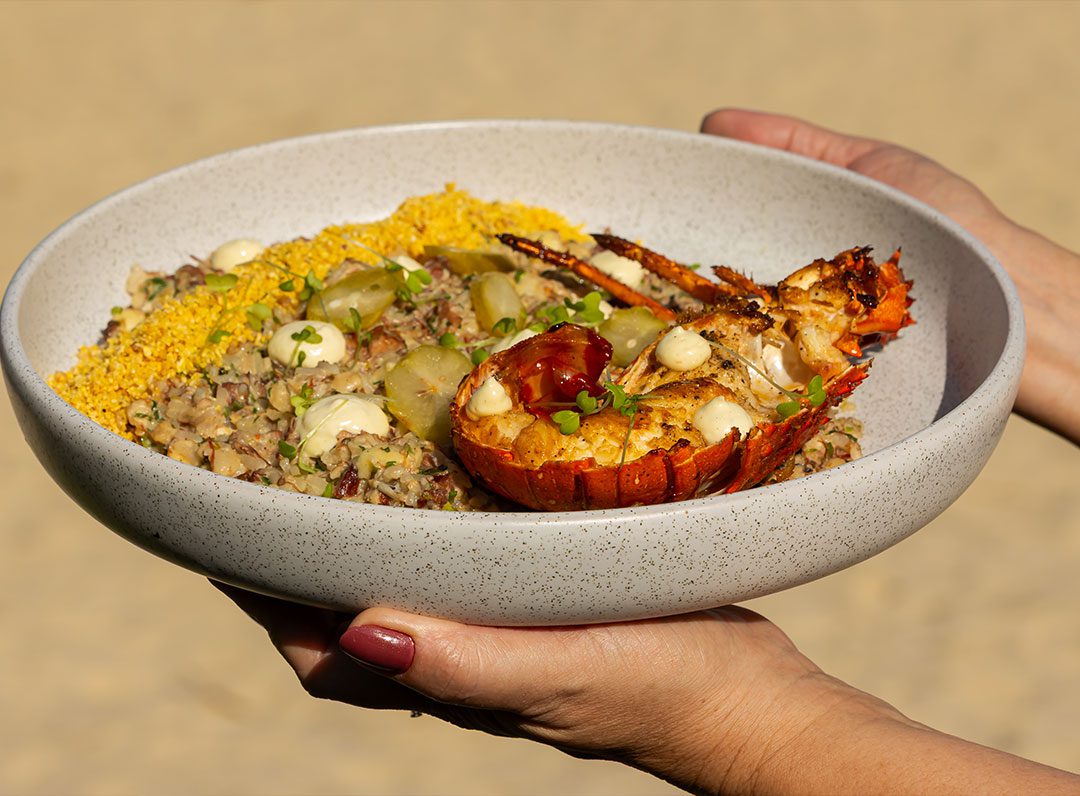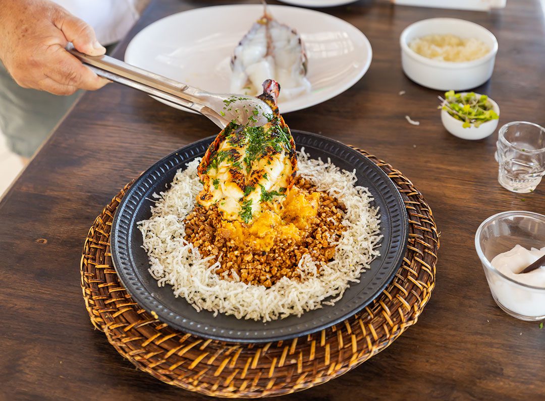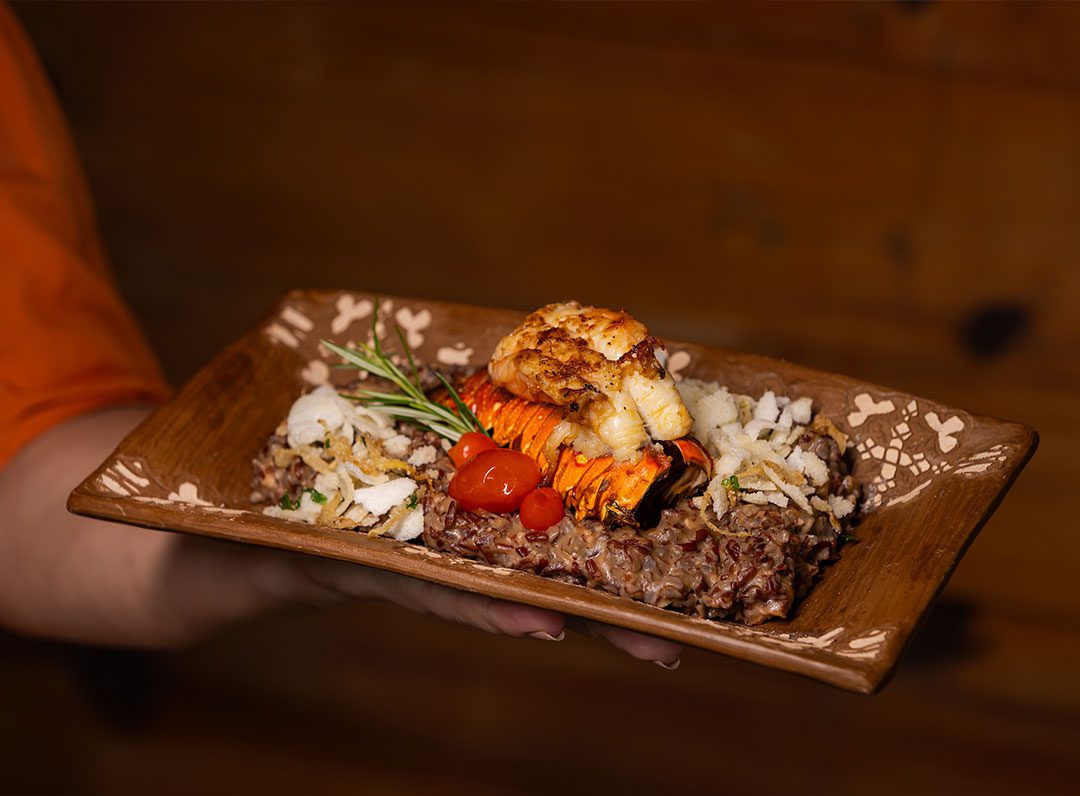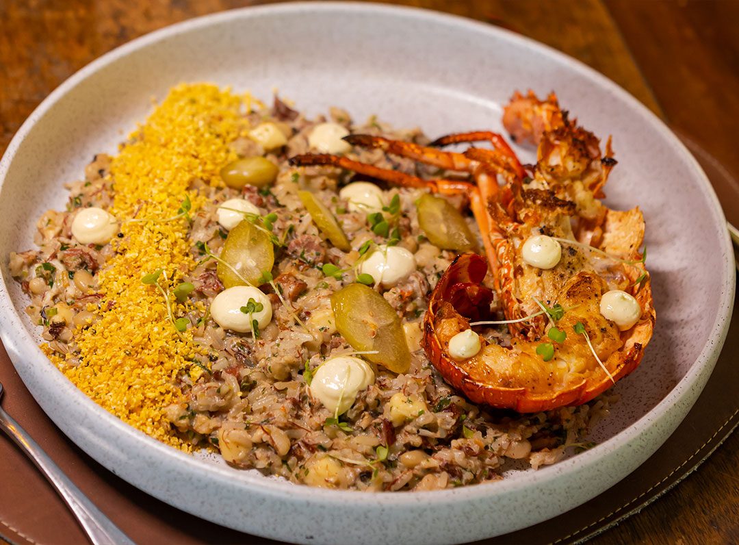 Lagosta na brasa acompanhada com arroz de Licuri e farofinha crocante de tapioca