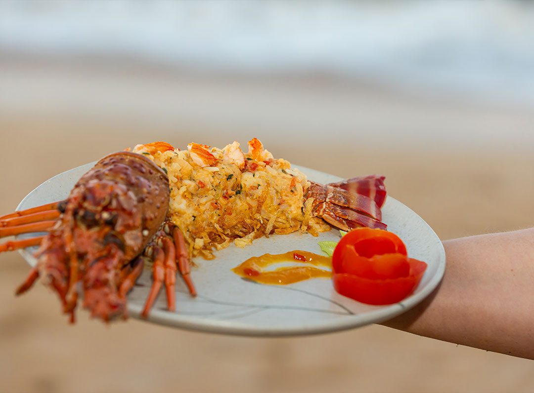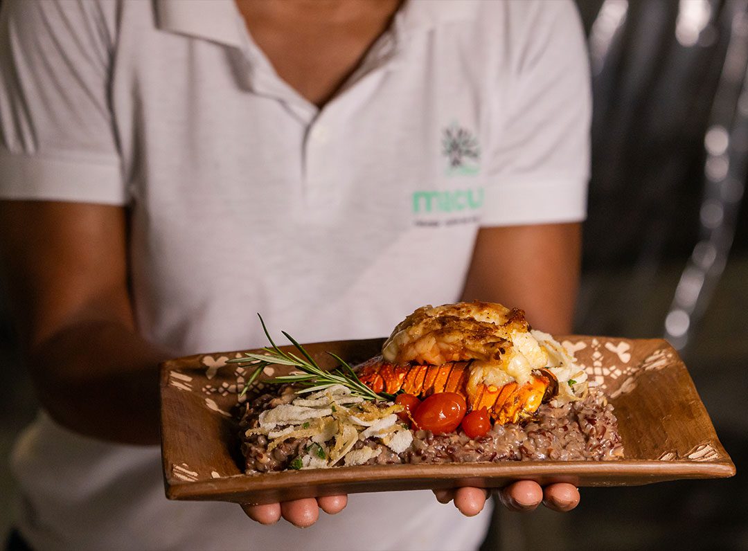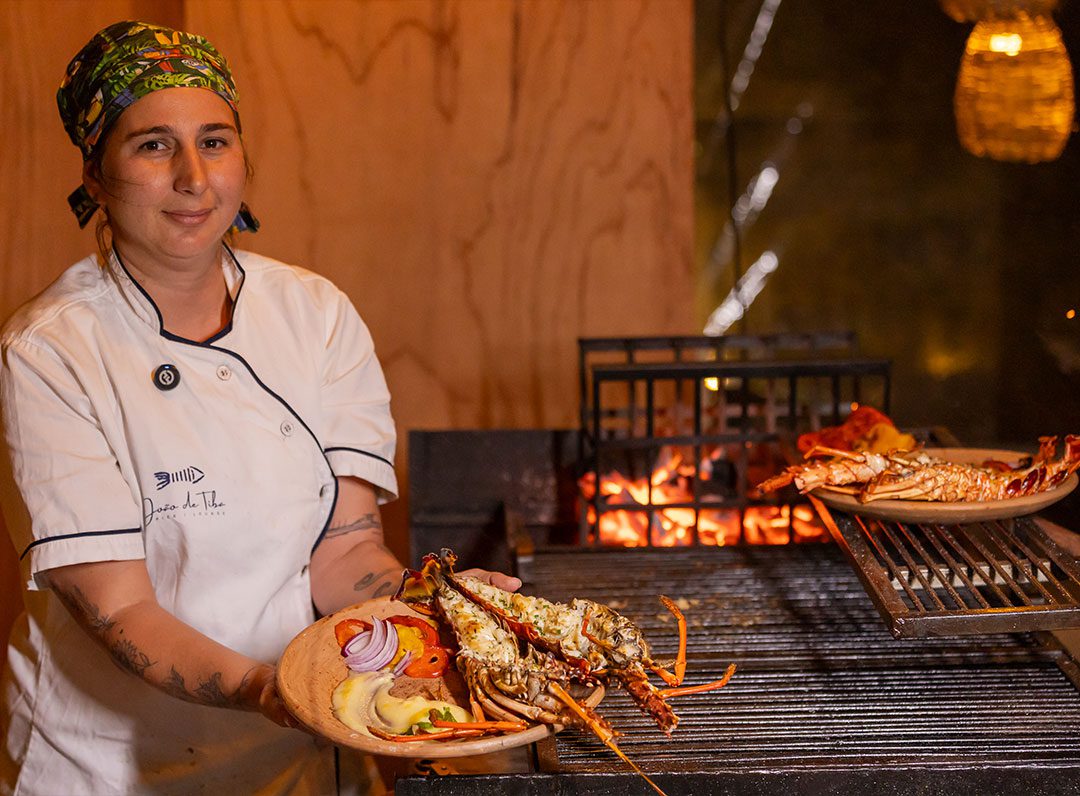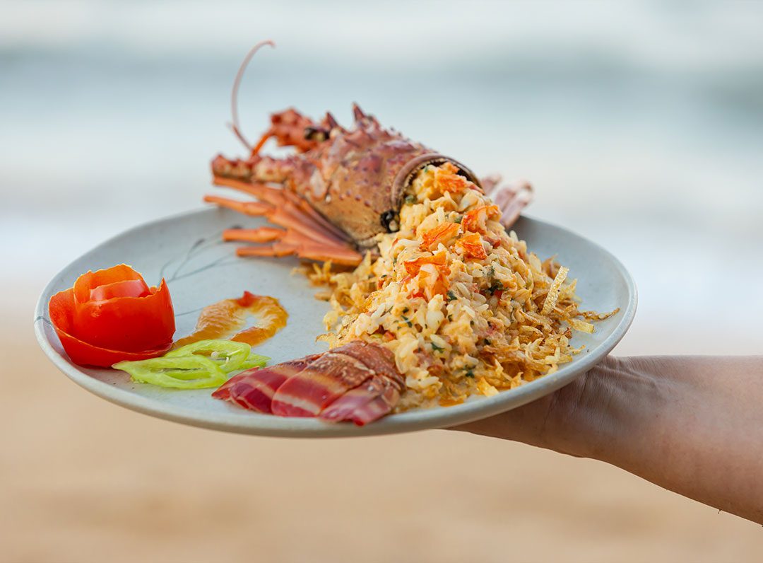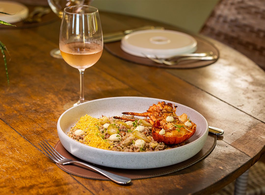 Lagosta na brasa acompanhada com arroz de Licuri e farofinha crocante de tapioca